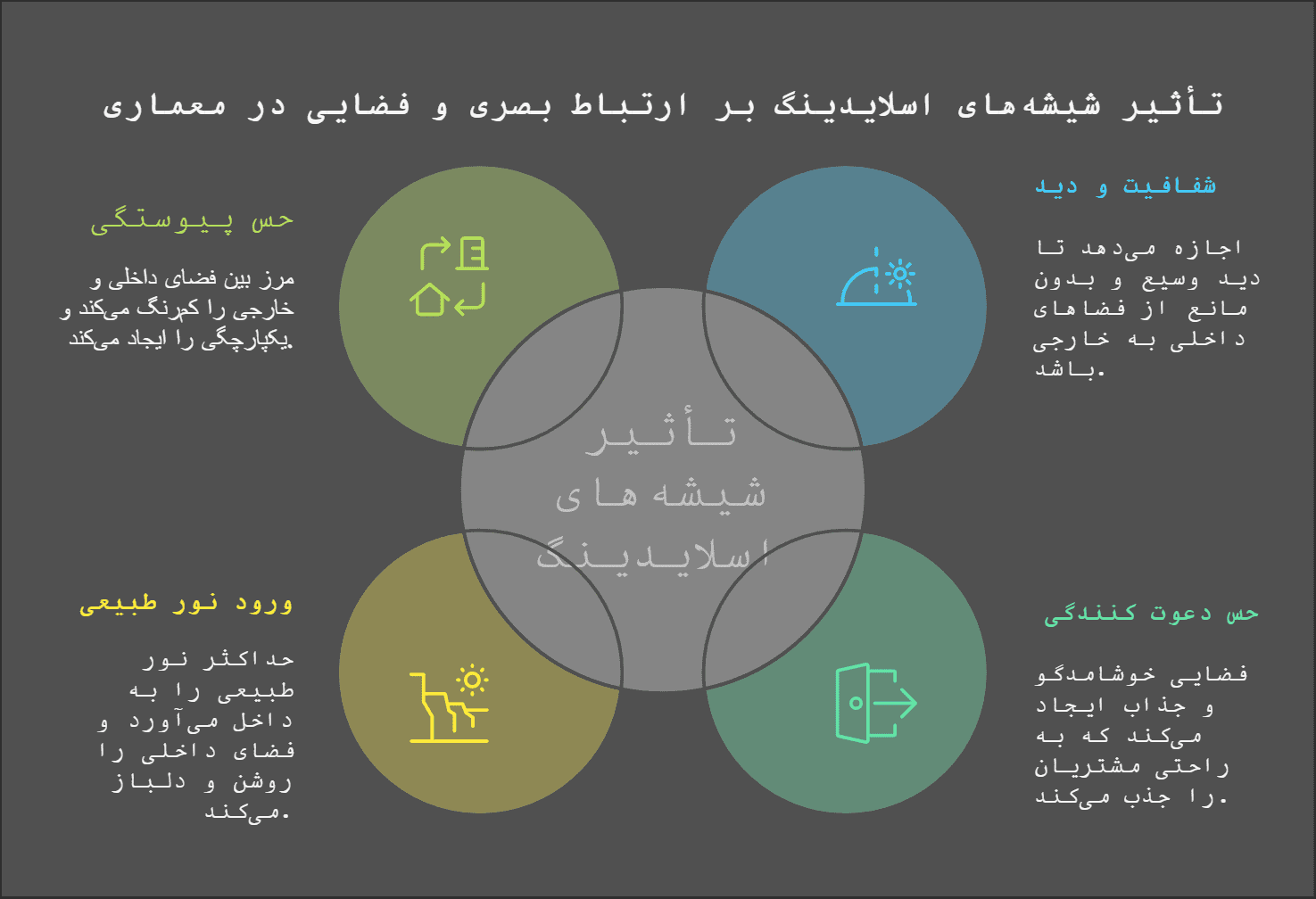 استفاده از شیشه اسلایدینگ در معماری مدرن، راهکاری مناسب برای ایجاد ارتباط بصری بین فضای داخلی و خارجی، ورود نور طبیعی و ایجاد حس دلبازی و وسعت در فضا است. با رعایت نکات فنی و طراحی صحیح، میتوان از این عنصر معماری به بهترین نحو در طراحی فضاهای مختلف استفاده کرد.