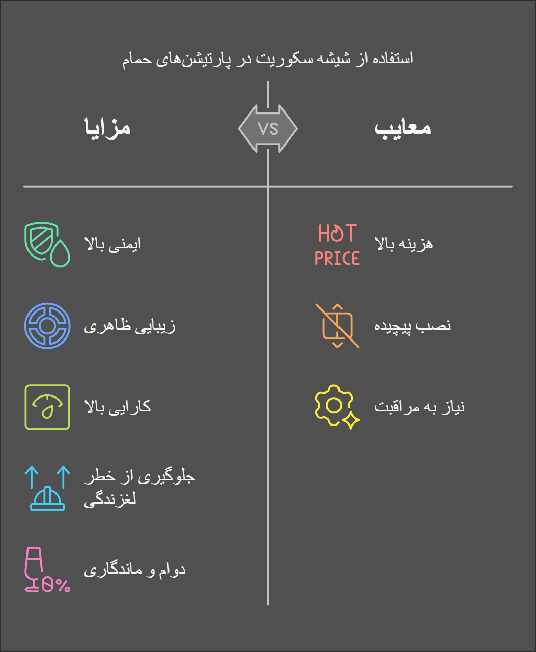 با توجه به مزایای فراوان شیشه سکوریت، استفاده از این نوع شیشه در پارتیشنهای حمام نه تنها باعث افزایش ایمنی شما و سایر اعضای خانواده میشود، بلکه زیبایی و کارایی پارتیشن را نیز دو چندان میکند.
