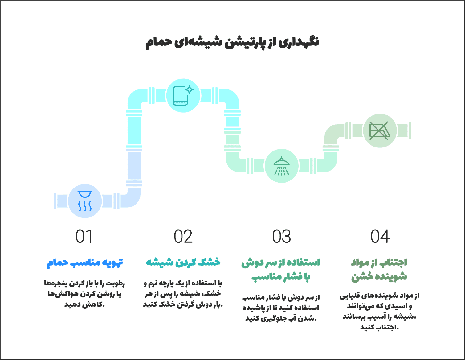 • بهتر است شیشه پارتیشن حمام را هفته‌ای یک بار به طور کامل تمیز کنید.