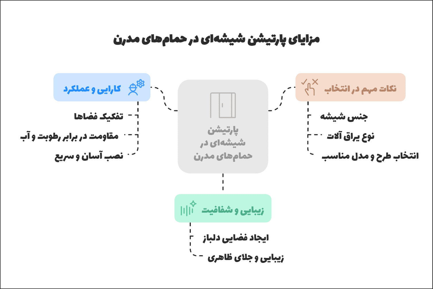 • تفکیک فضاها: پارتیشن‌های شیشه‌ای به راحتی می‌توانند فضای حمام را به بخش‌های مختلف مانند فضای دوش، وان حمام، و سرویس بهداشتی تفکیک کنند بدون اینکه ارتباط بصری بین فضاها قطع شود.
